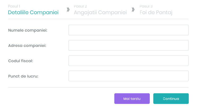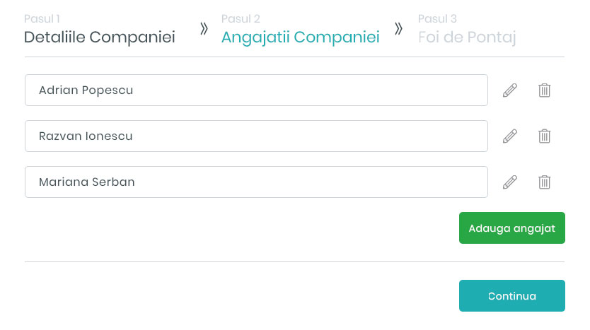 Următorul pas este să introduci detaliile companiei. Adaugă primul angajat folosind butonul Adaugă angajat. Completează numele acestuia și tipul de program pe care dorești să-l utilizezi (manual/automat). Poți adăuga acum și restul angajaților sau o poți face mai târziu.