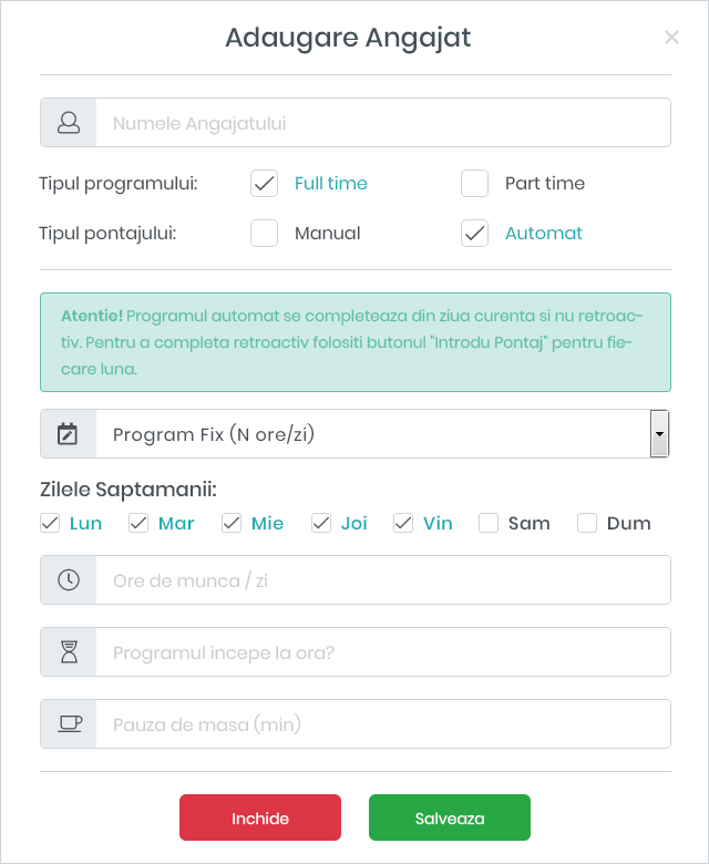Pentru a adăuga pontajul automat trebuie să parcurgi următorii pași: În meniul din stânga dă click pe Compania Mea. Adaugă angajații companiei tale folosind butonul Adaugă Angajat. Introdu numele angajatului, bifează Program Automat și tipul de program (Fix, 12/24, 12/48, inegal). Selectează zilele săptămânii în care muncește și numărul de ore pe care le lucrează zilnic. Adaugă și ora la care începe și durata pauzei de masă (în minute). Nu uita să apeși butonul Salvează Angajatul.